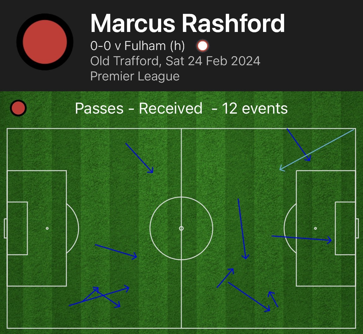 据统计,在上半场,拉什福德仅接到了队友送出的12脚传球。