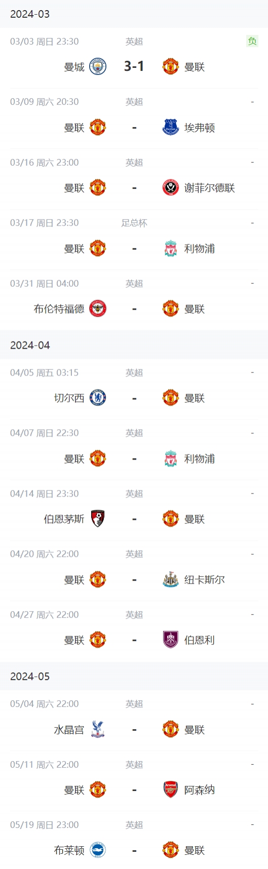 曼联本赛季余下赛程↓