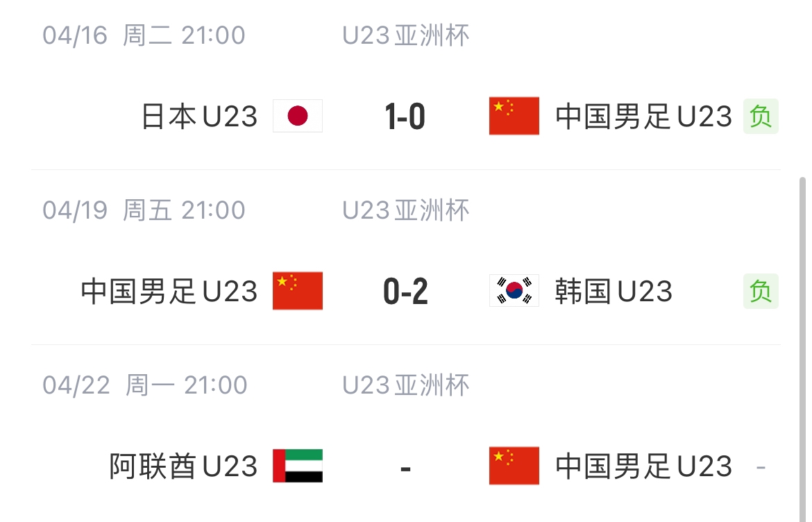 国奥与阿联酋U23目前都是小组赛两连败,且均0进球丢3球,最后一场4月22日两队将直接对决。