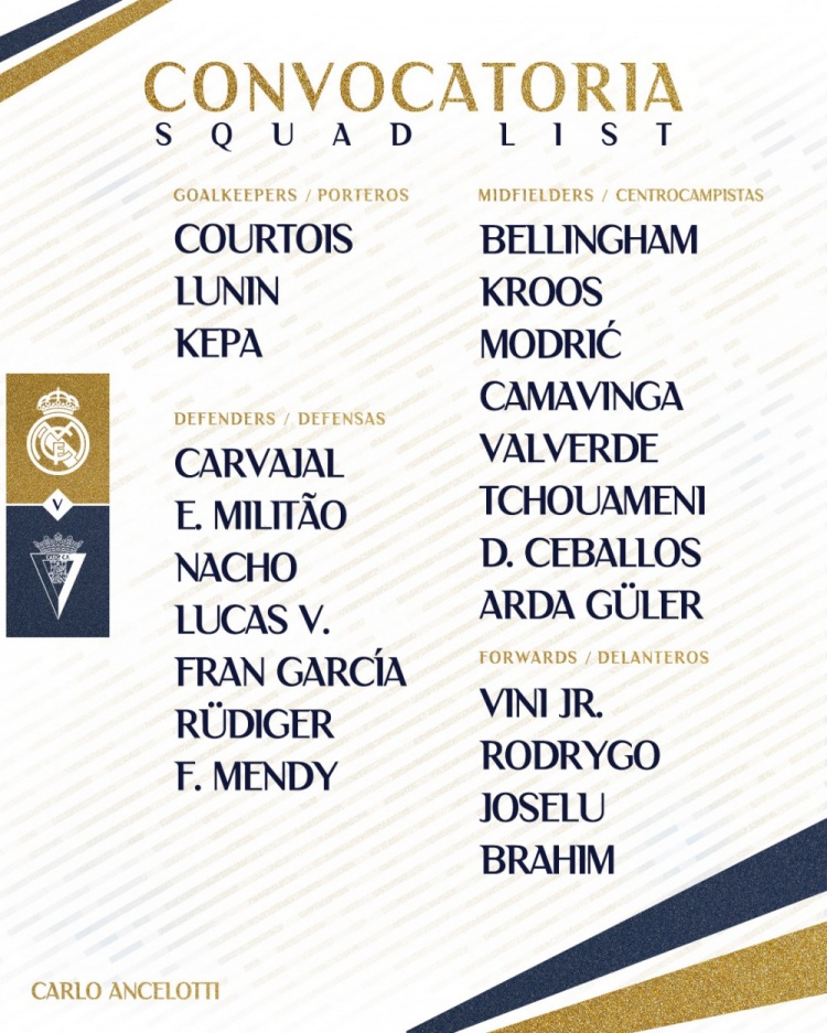 皇马对阵加的斯大名单: