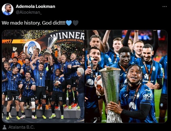 5月23日讯 亚特兰大前锋卢克曼今天在推特晒出球队捧起欧联杯冠军的照片,庆祝胜利。