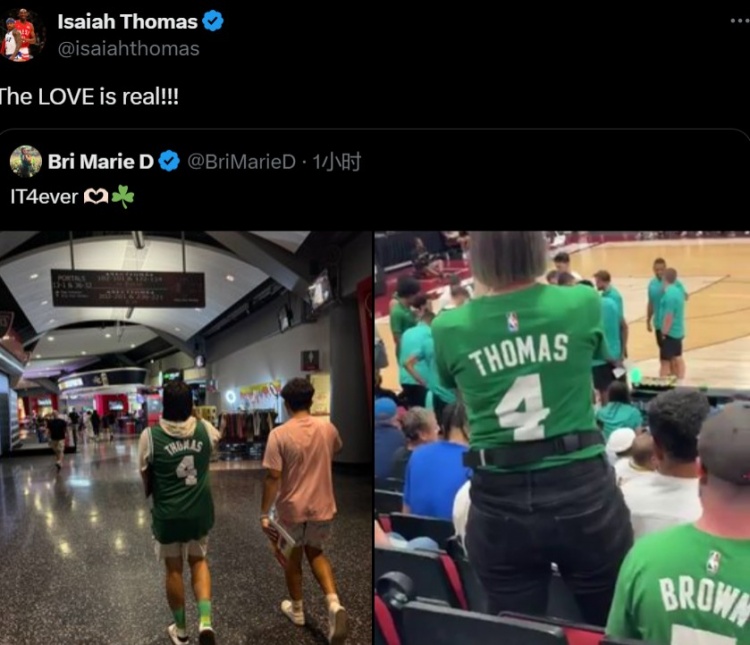 7月18日讯 今天,前凯尔特人球员小托马斯晒出了夏联赛场一些身着其4号球衣的凯尔特人球迷的照片。