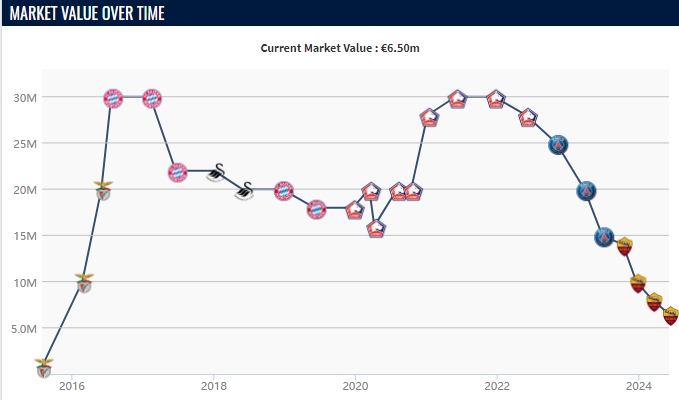 桑谢斯随后以3500万欧转会费加盟拜仁,在这几年间还曾效力过斯旺西、里尔、巴黎等队,2023年夏窗,桑谢斯被巴黎外租至罗马。上赛季,桑谢斯只为罗马出战12场,贡献了一个进球,总出场时间只有262分钟。