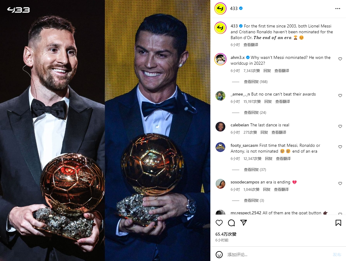 2024金球奖30人提名名单今日凌晨公布,梅西和C罗自2003年后首次皆无缘金球提名。
