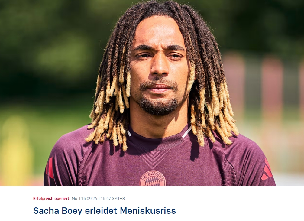 09月16日讯 拜仁慕尼黑足球俱乐部官方消息,一线队右后卫博伊左膝半月板撕裂,将缺席数周时间。