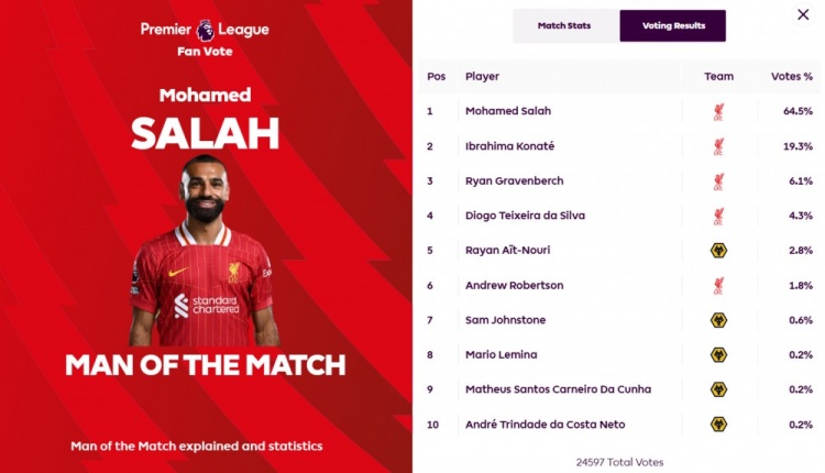 赛后,英超官方宣布,萨拉赫当选英超最佳球员,得票率64.5%。