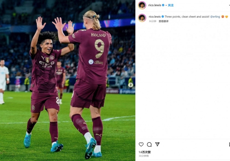 里科-刘易斯也通过社媒晒出他和哈兰德庆祝的合照,并配文:“3分,零封,并且给哈兰德送上助攻!”