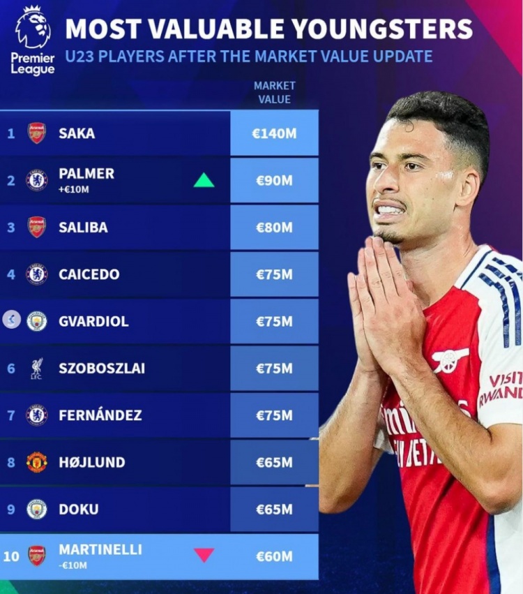 10月2日讯 《转会市场》在近日更新了英超球员身价榜,并列出了英超U23球员身价情况,萨卡以1.4亿欧元独自领跑。