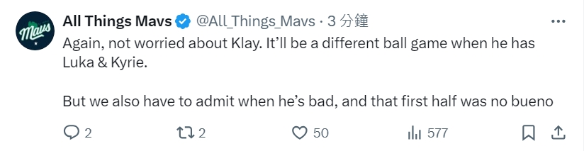 对此,独行侠自媒体表示:“再说一次,我不担心克莱,在有了卢卡和欧文之后,那会是完全不同的比赛。但是克莱打得不好的时候我们也要承认,这个上半场确实不太行。”