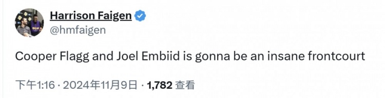 湖人随队记者Harrison Faigen发推调侃76人:“库珀-弗拉格(明年状元大热门)和恩比德的前场组合会令人疯狂。”