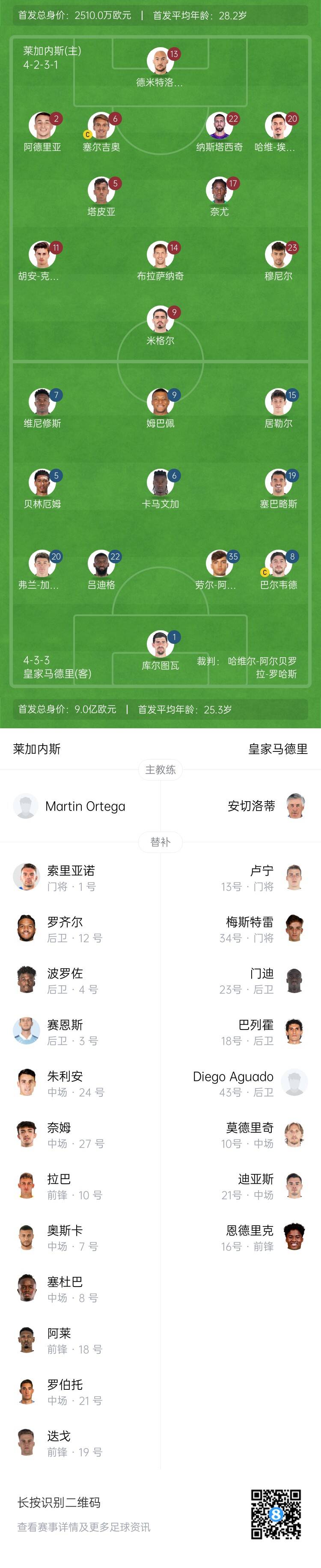 莱加内斯首发:13-德米特洛维奇、2-阿德里亚-阿尔蒂米拉、6-塞尔吉奥-冈萨雷斯、20-哈维-埃尔南德斯、22-纳斯塔西奇、5-雷纳托-塔皮亚、14-布拉萨纳茨、17-伊万-内尤、9-米格尔-德拉富恩特、11-胡安-克鲁斯、23-穆尼尔