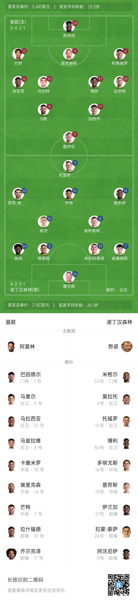 曼联首发:24-奥纳纳、4-德里赫特、6-利桑德罗、15-约罗、20-达洛特、25-乌加特、37-梅努、16-阿马德、8-B费、9-霍伊伦、17-加纳乔