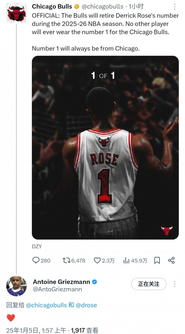 公牛宣布退役罗斯球衣,其忠实粉丝格列兹曼评论区留言: