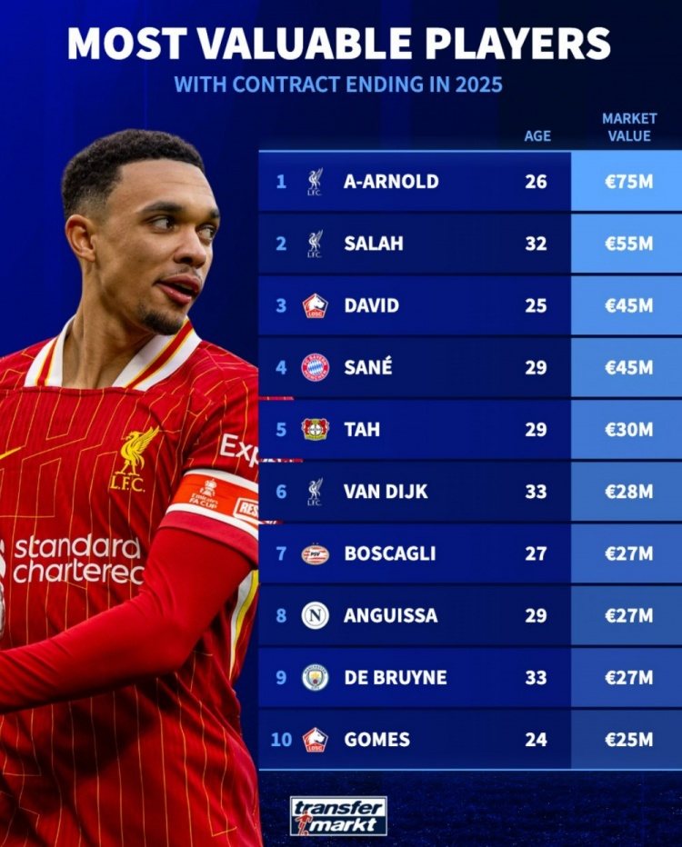 3月20日讯 德转盘点了目前合同将在今年到期的球员中身价最高榜单,其中阿诺德最高,利物浦三人都在前十,具体如下: