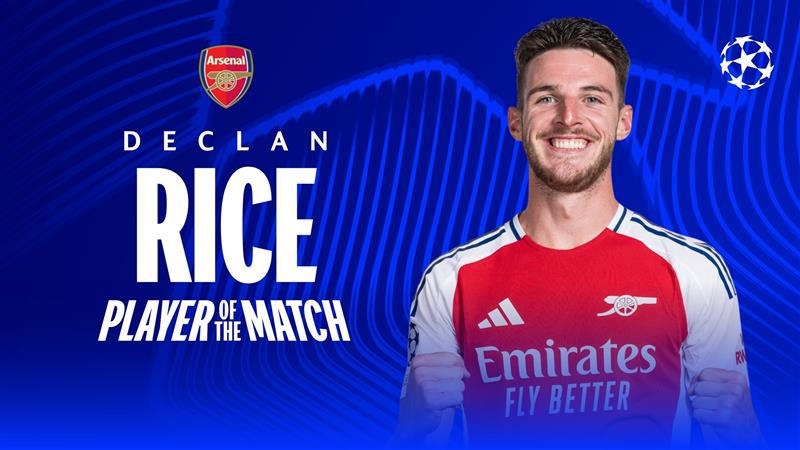 04月09日讯 欧冠1/4决赛首回合,阿森纳主场3-0战胜皇马,赖斯任意球梅开二度,当选全场最佳球员。