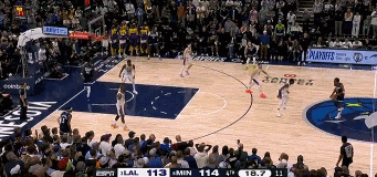 最后关键回合,詹姆斯切球打到爱德华兹大腿出界,裁判给湖人球权,森林狼挑战。