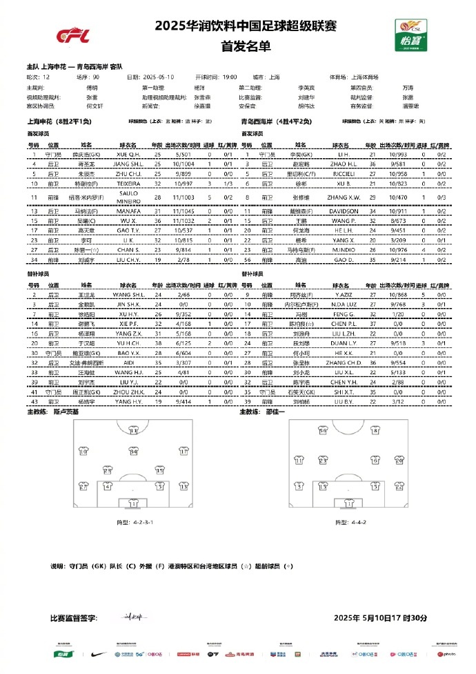 2025中超联赛第12轮上海申花vs青岛西海岸首发名单