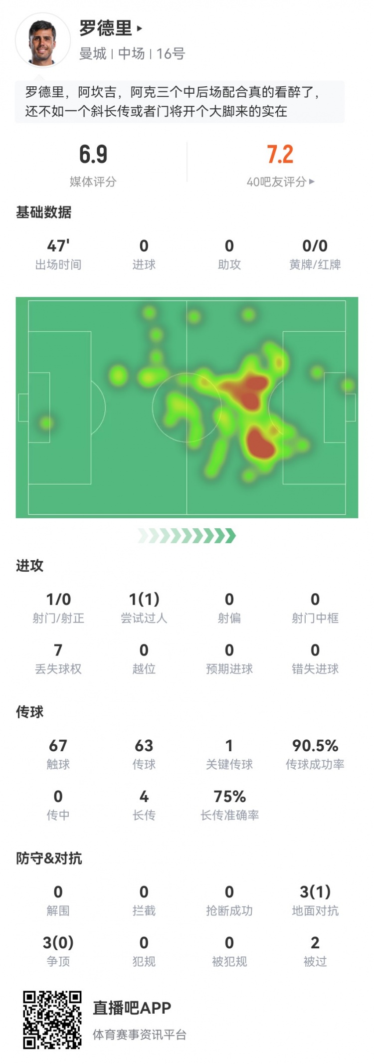 换上又换下!罗德里本场数据:1关键传球+4长传3成功6对抗1成功