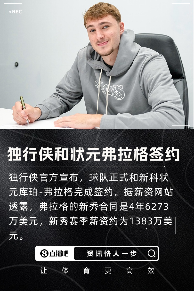 4年6273万!菜鸟赛季年薪1383万官方:独行侠正式签下状元弗拉格