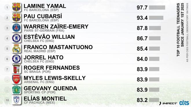 1、亚马尔(巴萨/西班牙)97.72、库巴西(巴萨/西班牙)93.43、埃梅里(巴黎圣日耳曼/法国)87.84、埃斯特旺(切尔西/巴西)86.75、马斯坦托诺(皇马/阿根廷)85.46、哈托(切尔西/荷兰)84.07、罗热-费尔南德斯(布拉加/葡萄牙)83.97、刘易斯-斯凯利(阿森纳/英格兰)83.97、热奥瓦尼-昆达(葡萄牙体育/葡萄牙)83.910、埃利亚斯-蒙铁尔(帕丘卡/墨西哥)83.2【上咪咕独家看英超】
