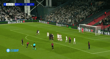 第82分钟,勒沃库森弧顶前沿任意球机会,格里马尔多主罚直挂球门死角,勒沃库森1-1哥本哈根。↓