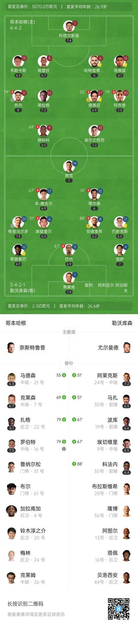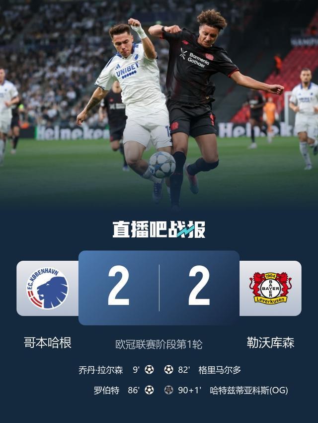 全场比赛结束,哥本哈根2-2勒沃库森。