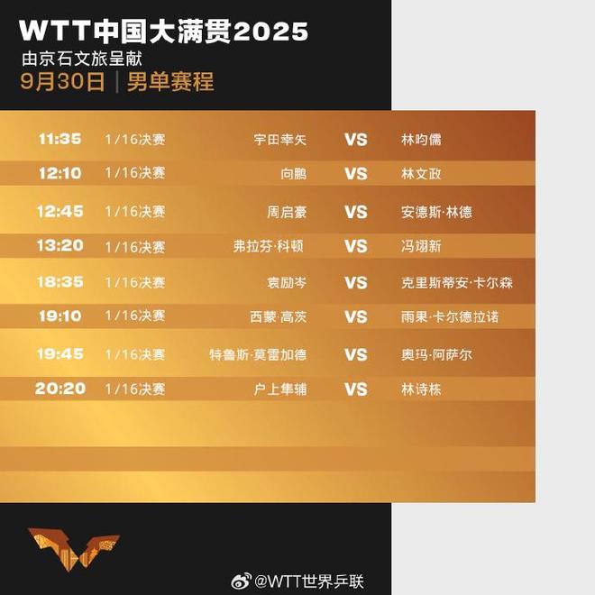 WTT中国大满贯30日赛程