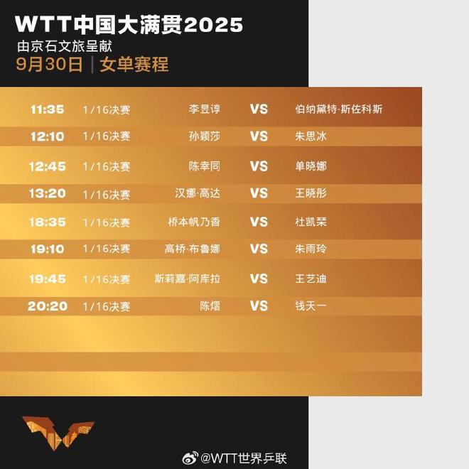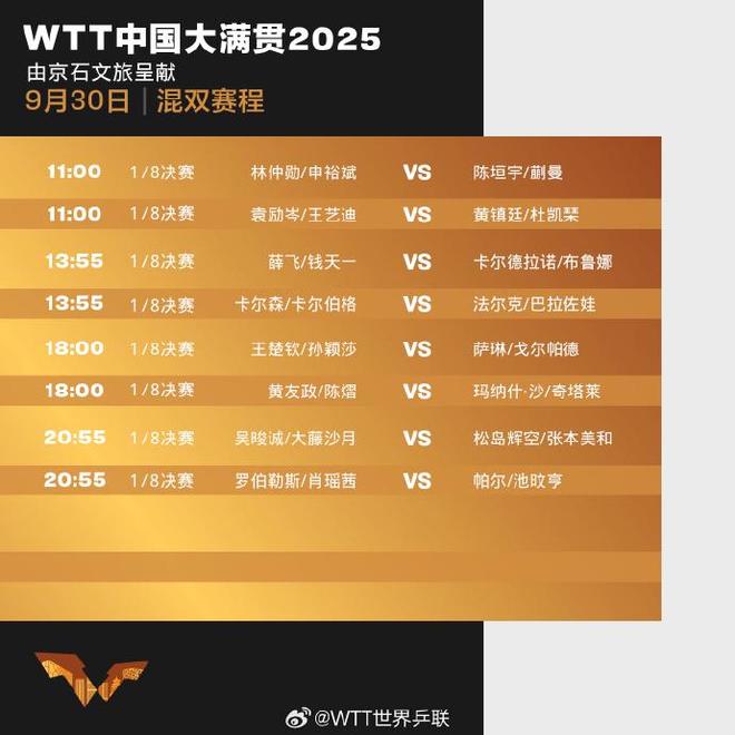 WTT中国大满贯2025精彩对决继续在石景山首钢园上演,“莎头组合”混双出战,具体赛程如下: