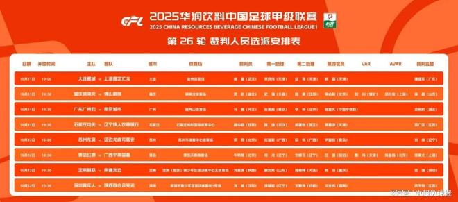 刚刚,中足联官网公布了中甲联赛第26轮裁判人员选派安排表。安排表显示,本轮的冲超、保级关键战得到了重点关注,不仅选派有中超执哨经验的主裁判,而且还启用了VAR。