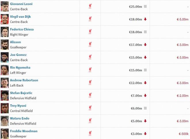 - 英超 | 利物浦球员身价变动:伊萨克维尔茨下跌2000万欧,萨拉赫下跌1500万欧