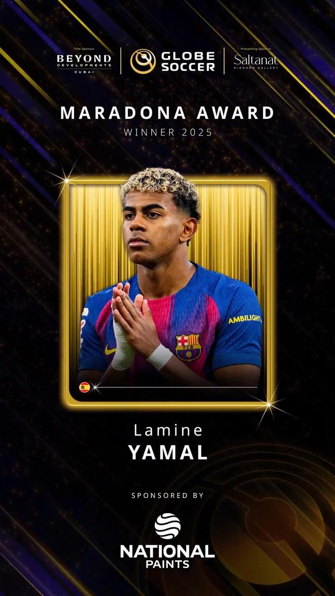 官方:亚马尔荣获环球足球奖2025年马拉多纳奖