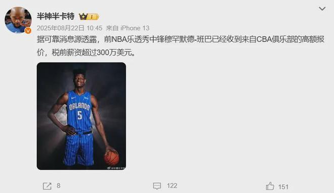 班巴在NBA之外的联赛乃绝对的香饽饽,去年休赛期某CBA俱乐部甚至不惜报价薪资税前超过300万美元,可显而易见当时他对此无动于衷,如今就未必了。