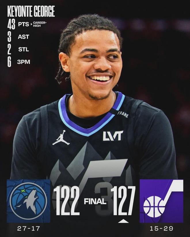 单场43分,打破了基昂特-乔治生涯得分纪录!本赛季他为爵士打了43场比赛,只缺席了1场。场均出战34.4分钟,得到24.4分4篮板6.7助攻1抢断3.5失误,三项命中率:45.9%,37.6%,90.3%。场均得分联盟第19,助攻联盟第14。
